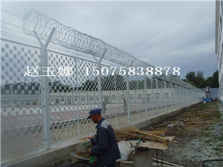 主要是采用高強(qiáng)度的刀片刺網(wǎng)與普通防護(hù)網(wǎng)的結(jié)合,由V型支架立拄,加強(qiáng)型焊接片網(wǎng),安全防盜連接件和刀片刺網(wǎng)組成.